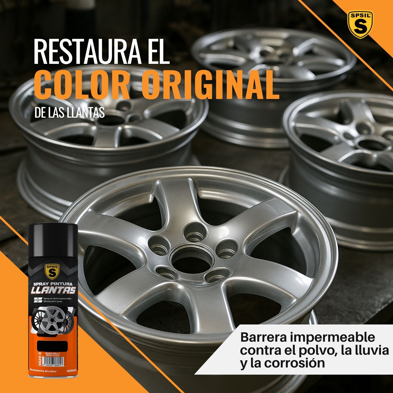 - Restauración de Color: la Pintura de Llantas SPSIL devuelve el brillo y el color originales a tus llantas, haciendo que luzcan como nuevas.