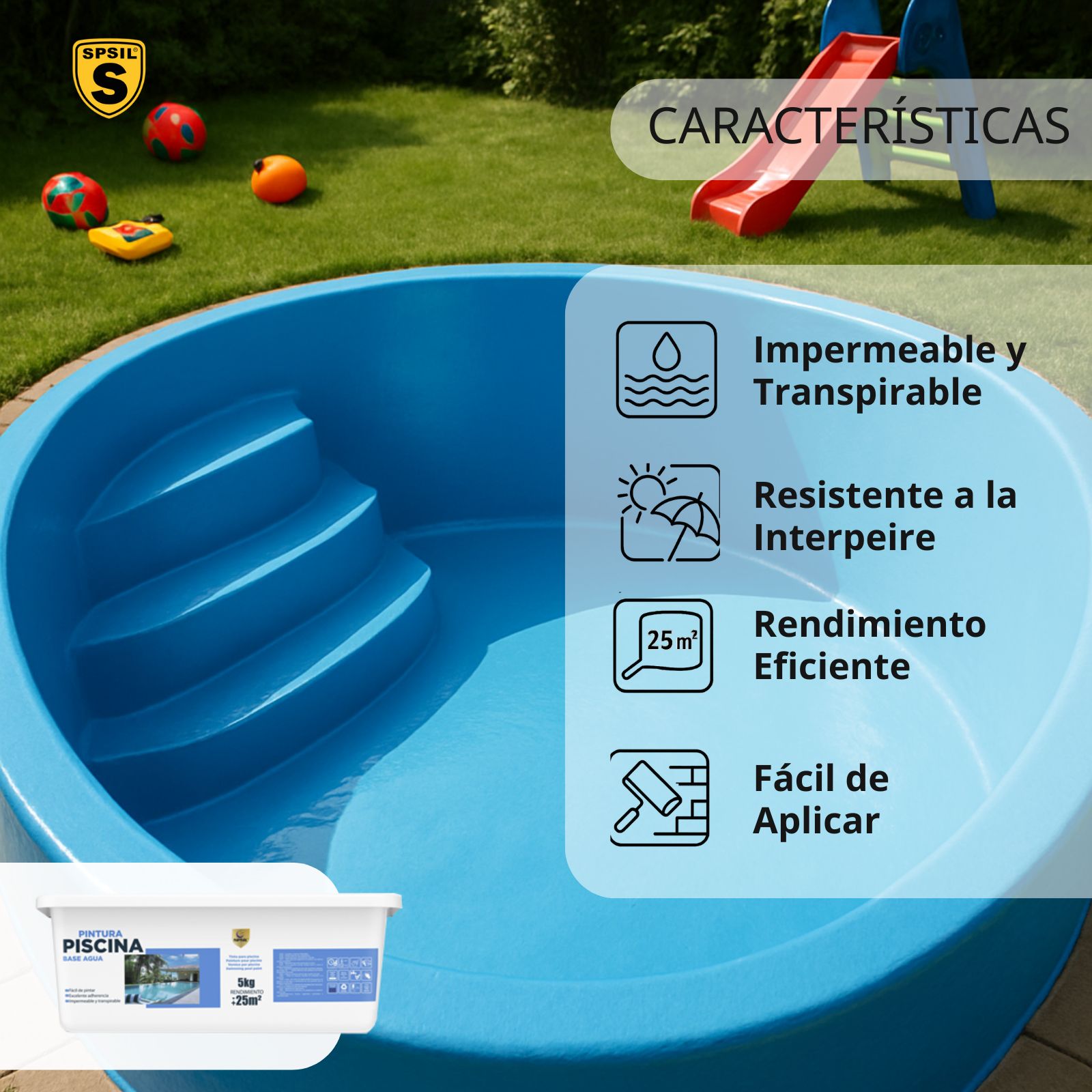 Descripción del Producto: La Pintura para Piscina Spsil es la solución ideal para embellecer y proteger tu piscina. Con su formulación a base de agua, esta pintura ofrece una excelente adherencia y es completamente impermeable y transpirable. Diseñada específicamente para resistir las condiciones ambientales extremas, garantiza un acabado duradero que realza el color azul de tus espacios acuáticos. Cada envase de 5 kg rinde hasta 25 m², lo que la convierte en una opción económica y eficiente para mantener tu piscina en perfectas condiciones.
