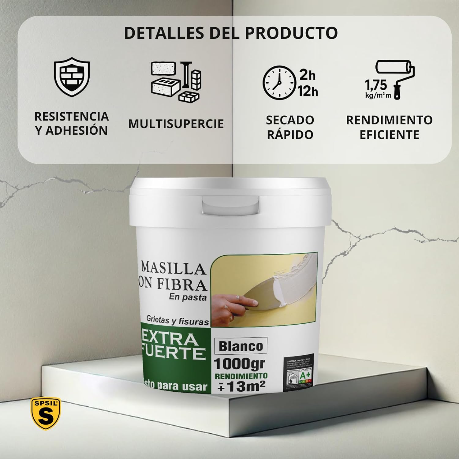 La Masilla con Fibra de Vidrio de SPSIL está formulada para ofrecer una superficie nivelada y resistente, ideal para reparar juntas, grietas, fisuras, abolladuras e imperfecciones en diversas superficies como yeso, zócalos, rodapiés, madera y metal. Su alta resistencia la hace perfecta tanto para aplicaciones en interiores como en exteriores, garantizando un secado rápido y un acabado excelente en gotelé. Esta masilla no se agrieta, cuartea ni amarillea con el tiempo, asegurando resultados duraderos.