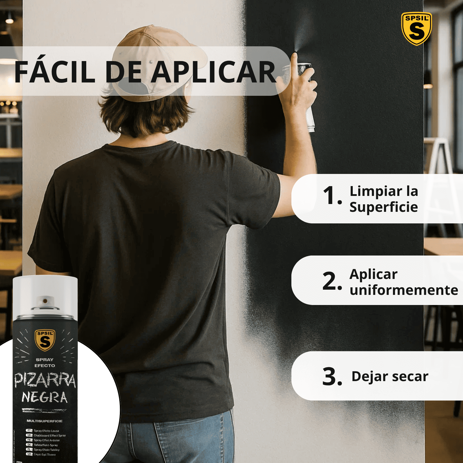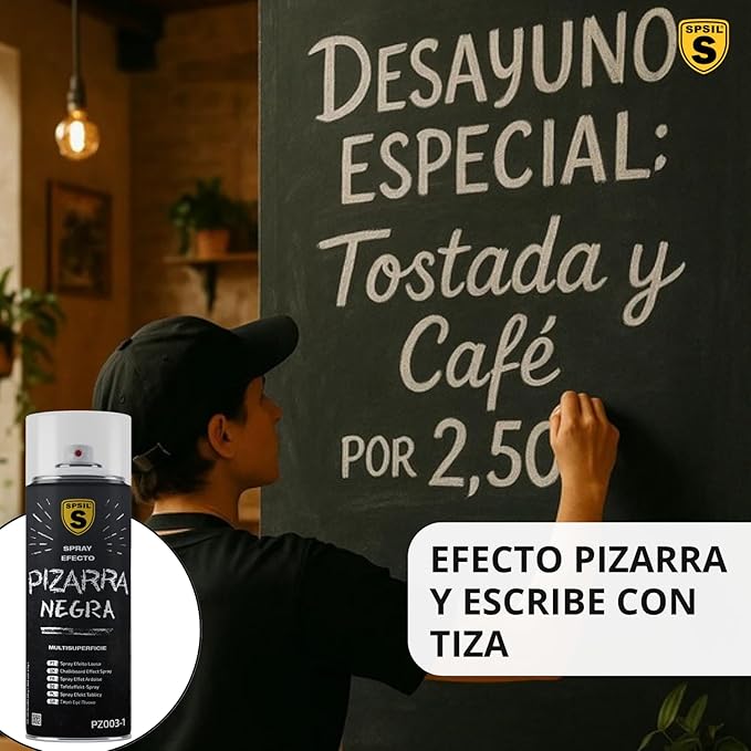 Transforma tu cafetería en un espacio único y lleno de personalidad con nuestra pintura en Spray Efecto Pizarra. Ideal para paredes y detalles decorativos, ofrece un acabado mate que invita a la creatividad.