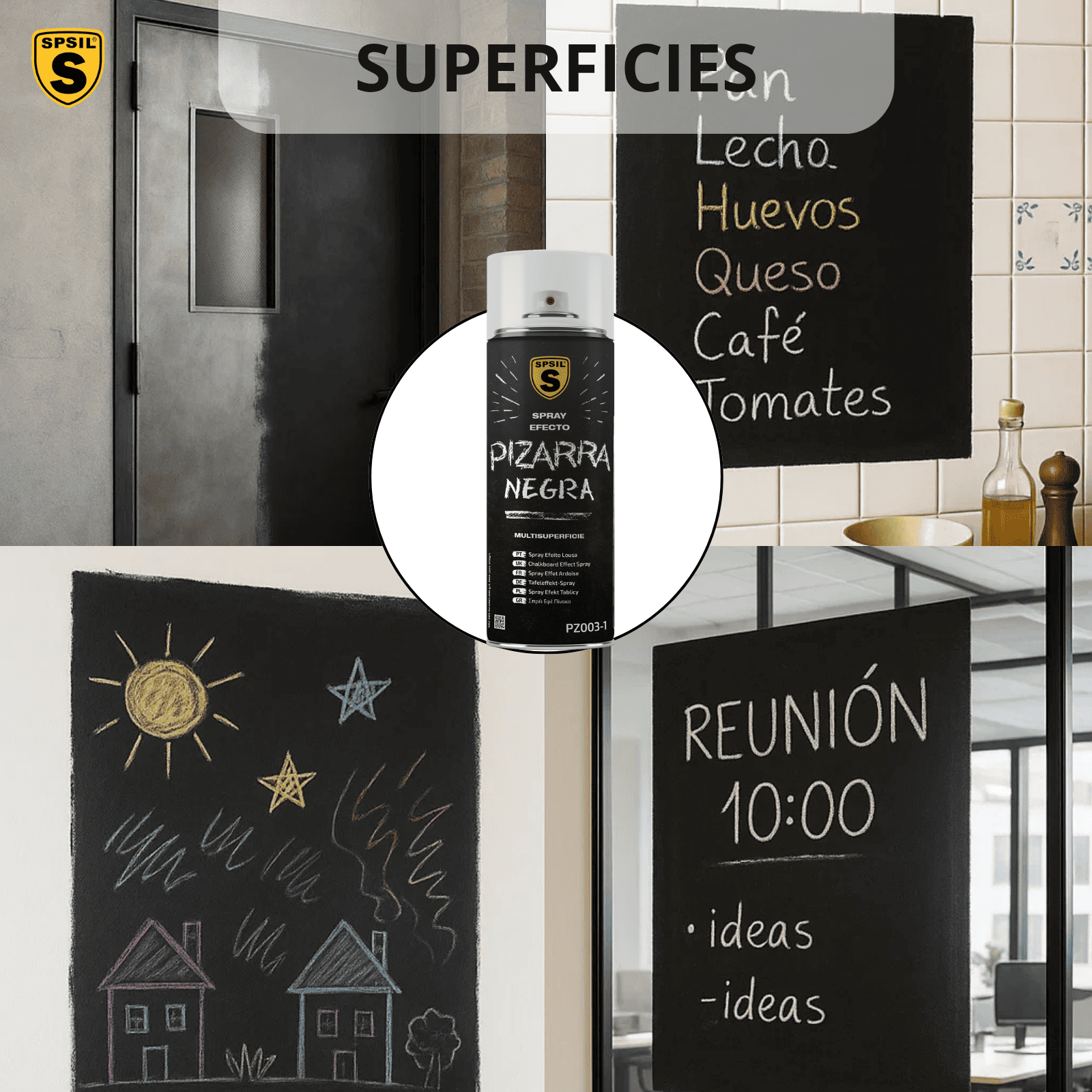 La Pintura Spray Efecto Pizarra Negra Spsil es la solución ideal para transformar cualquier superficie en una pizarra funcional y creativa. Con un rendimiento de 2 m² por bote de 400 ml y 1 m2 por bote de 200ml, este spray es perfecto para crear espacios donde la creatividad fluya, permitiendo que las ideas se plasmen fácilmente. Su formulación de alta calidad asegura una aplicación uniforme y un acabado que imita el aspecto de una pizarra real, brindando una superficie ideal para escribir y dibujar.Características Destacadas