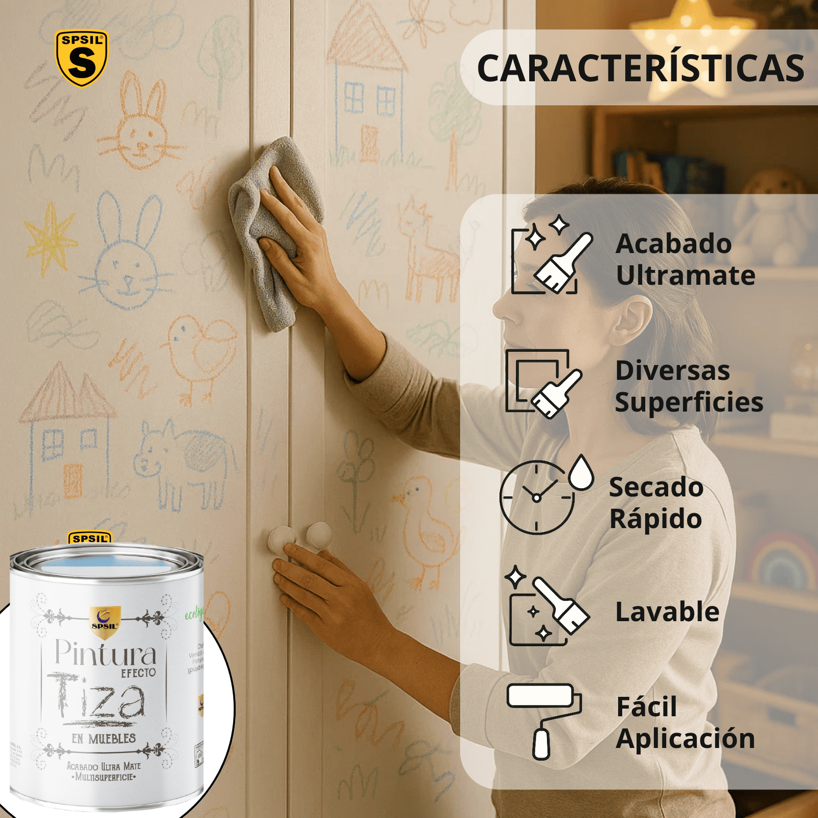 Con la Pintura a la Tiza de SPSIL, lograrás transformar tus espacios de manera sencilla y efectiva, asegurando resultados profesionales en cada proyecto de decoración.