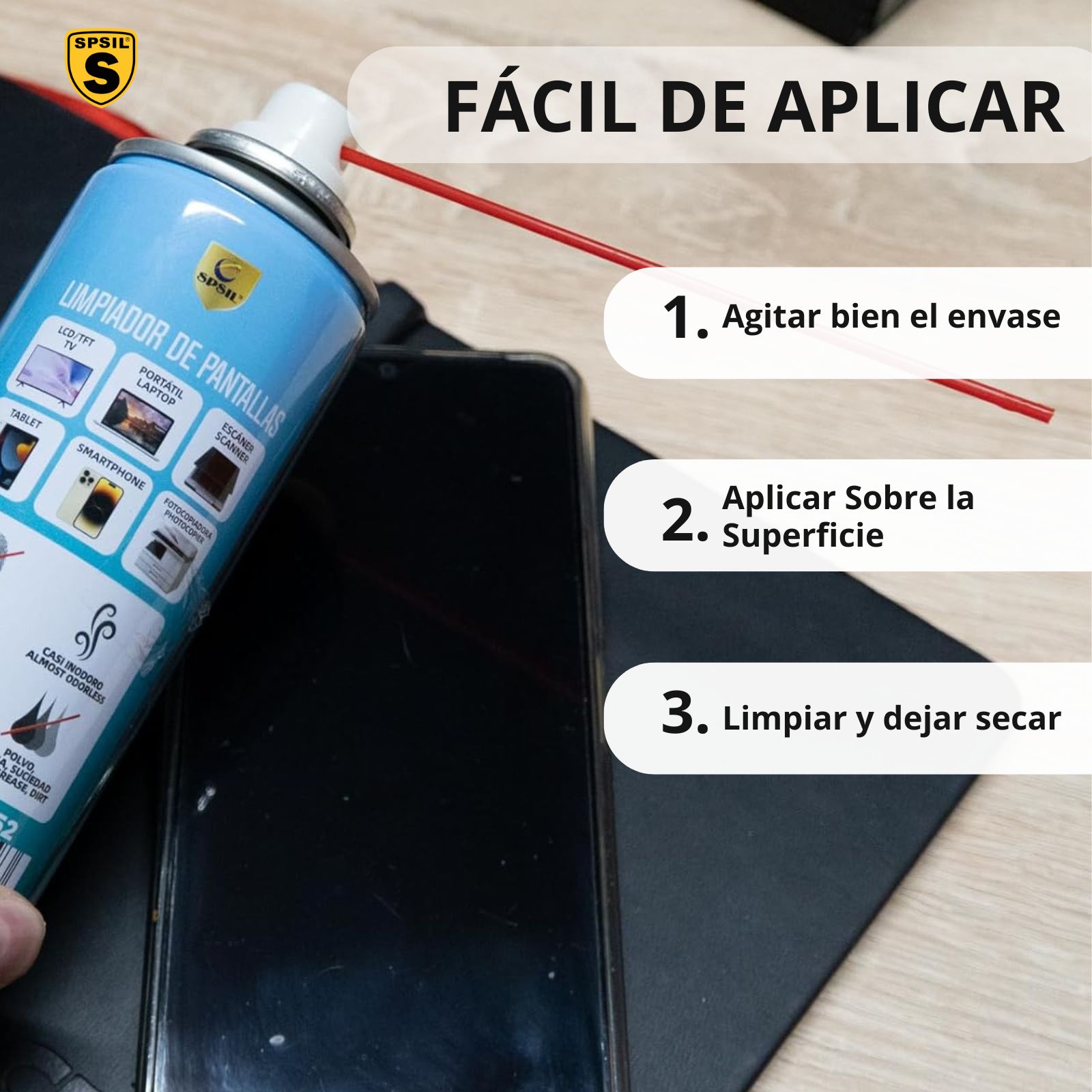 - Fórmula Casi Inodora: Sin olor desagradable, te permite aplicarlo en interiores y volver a usar tus dispositivos al instante.