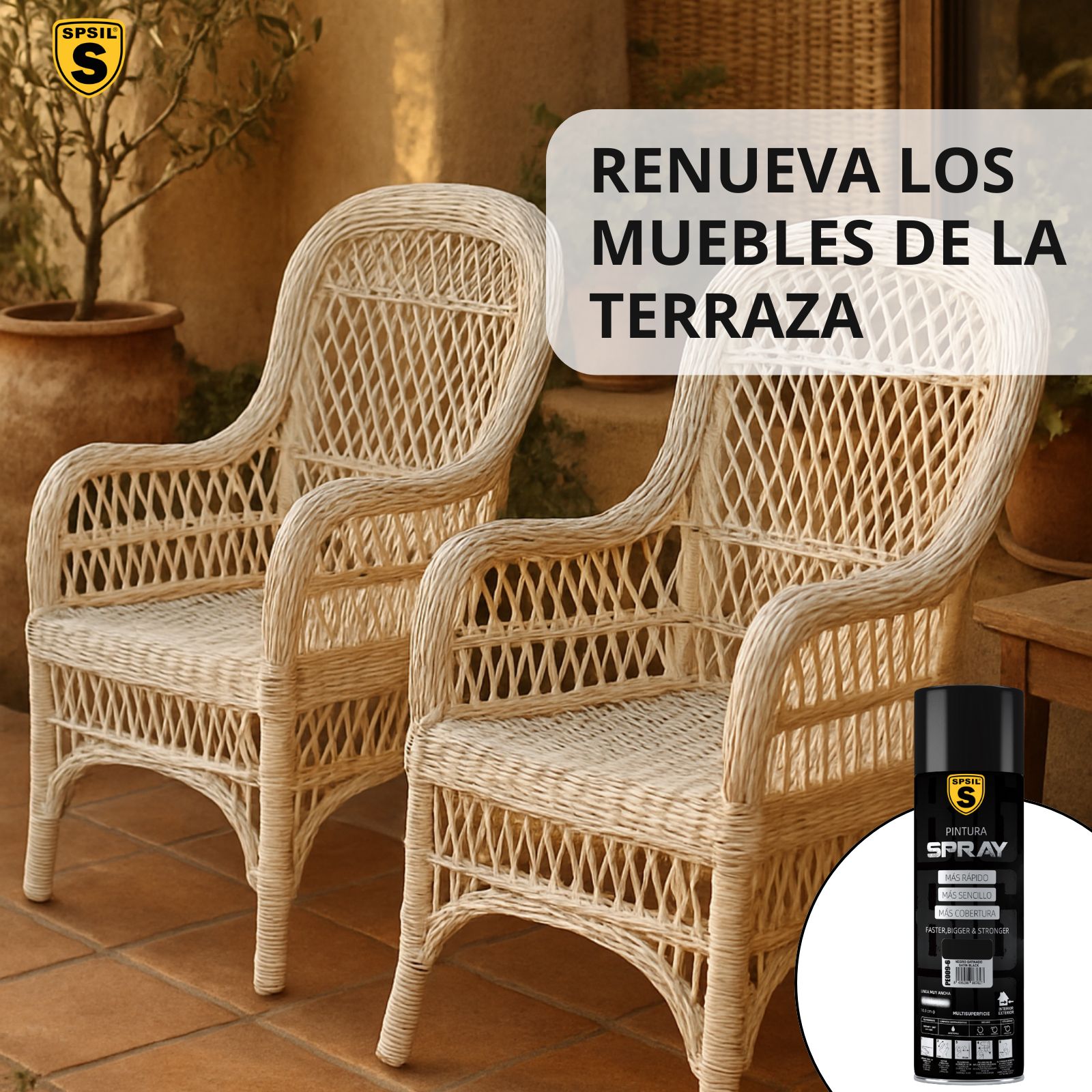 Transforma tus sillas de jardín con Spray Ala Cobertura blanco: renovación total con un acabado fresco y elegante para exteriores.